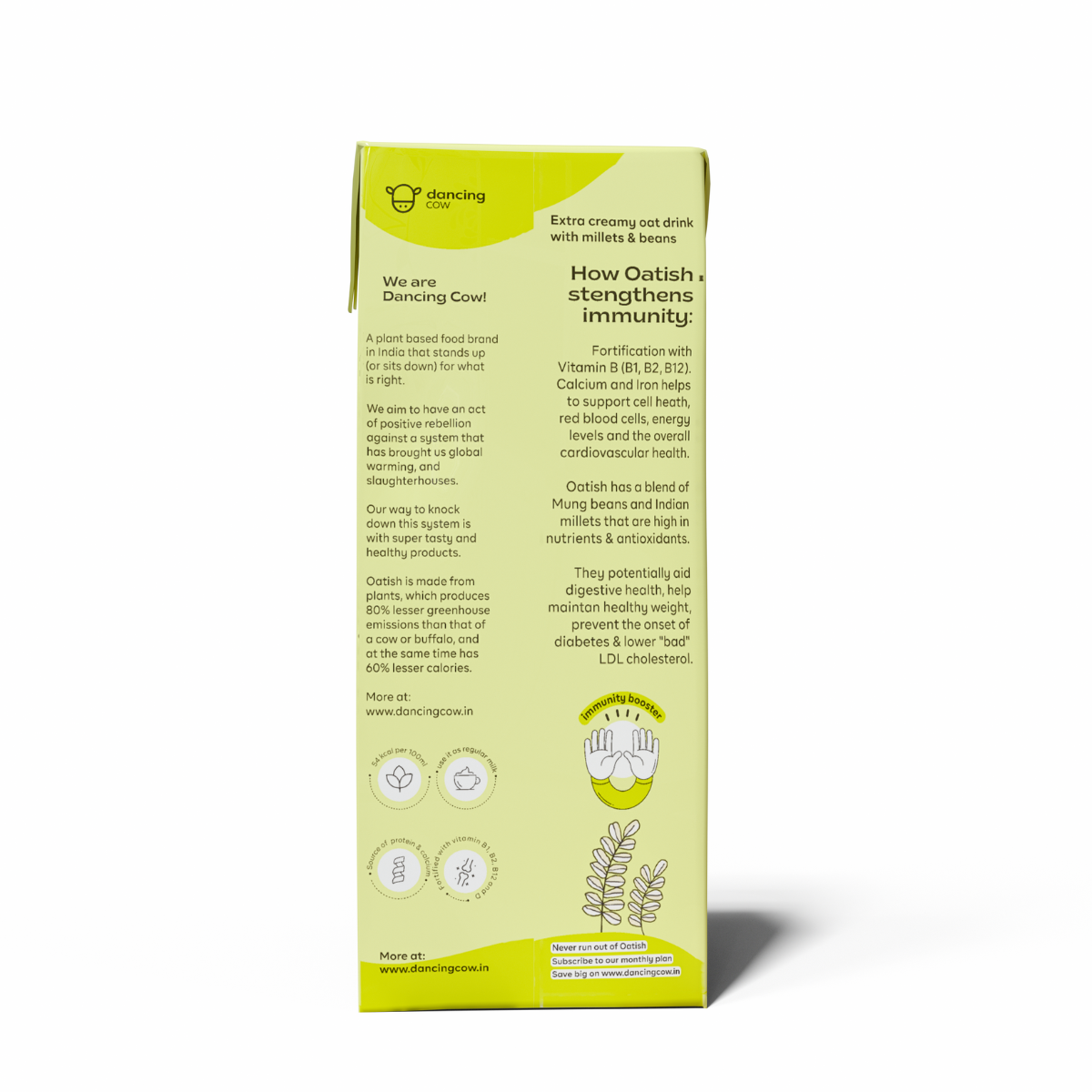 Oatish oat milk boasts a special blend of oats, millets, and mung beans, creating a powerhouse of nutrition. Rich in fiber, protein, and essential nutrients, this unique combination ensures a creamy texture and a burst of goodness in every sip.